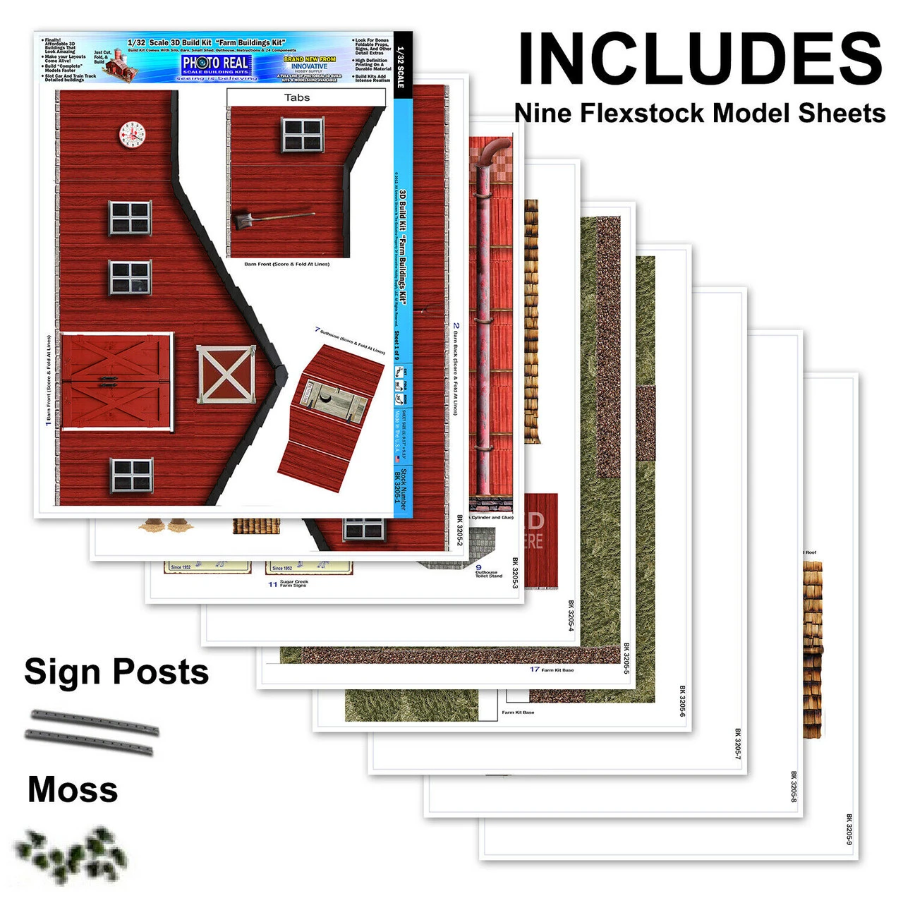 6 ea. Flexstock Model Sheets, 2 sign posts for additional signage, and 1 small package of Landscape Clump Moss that is enough to landscape this kit.