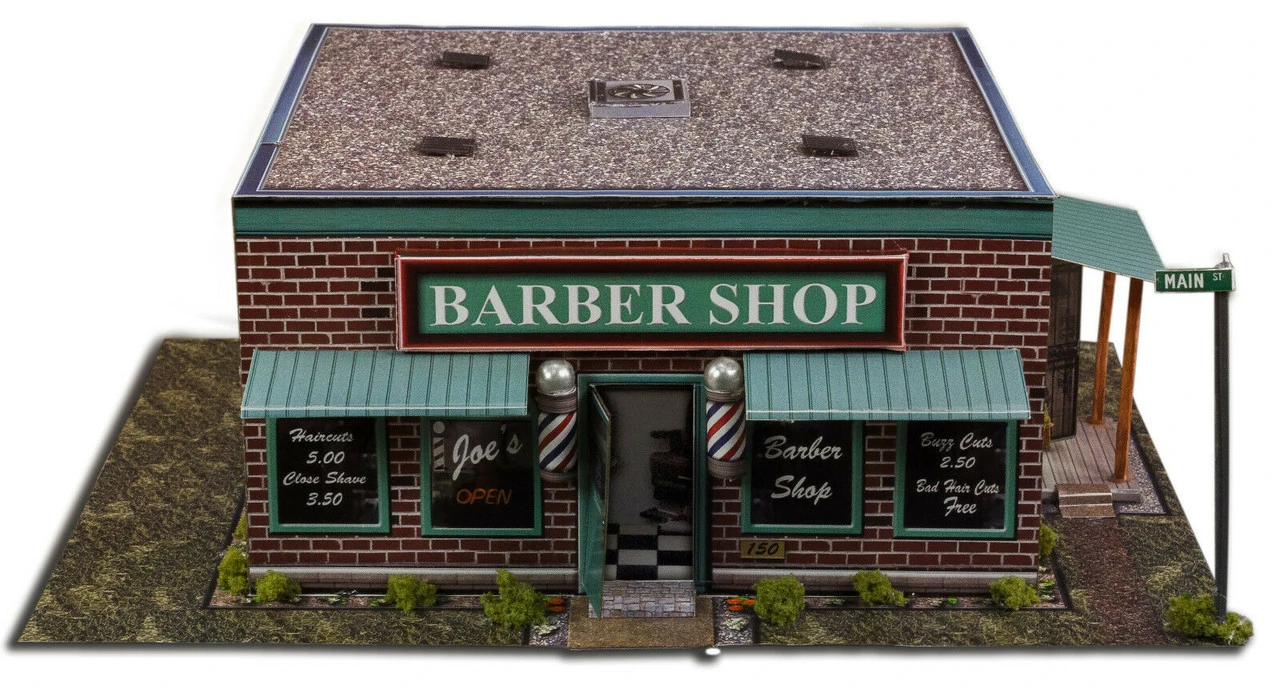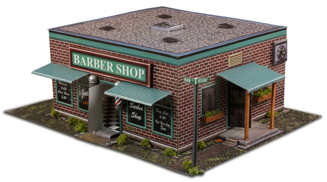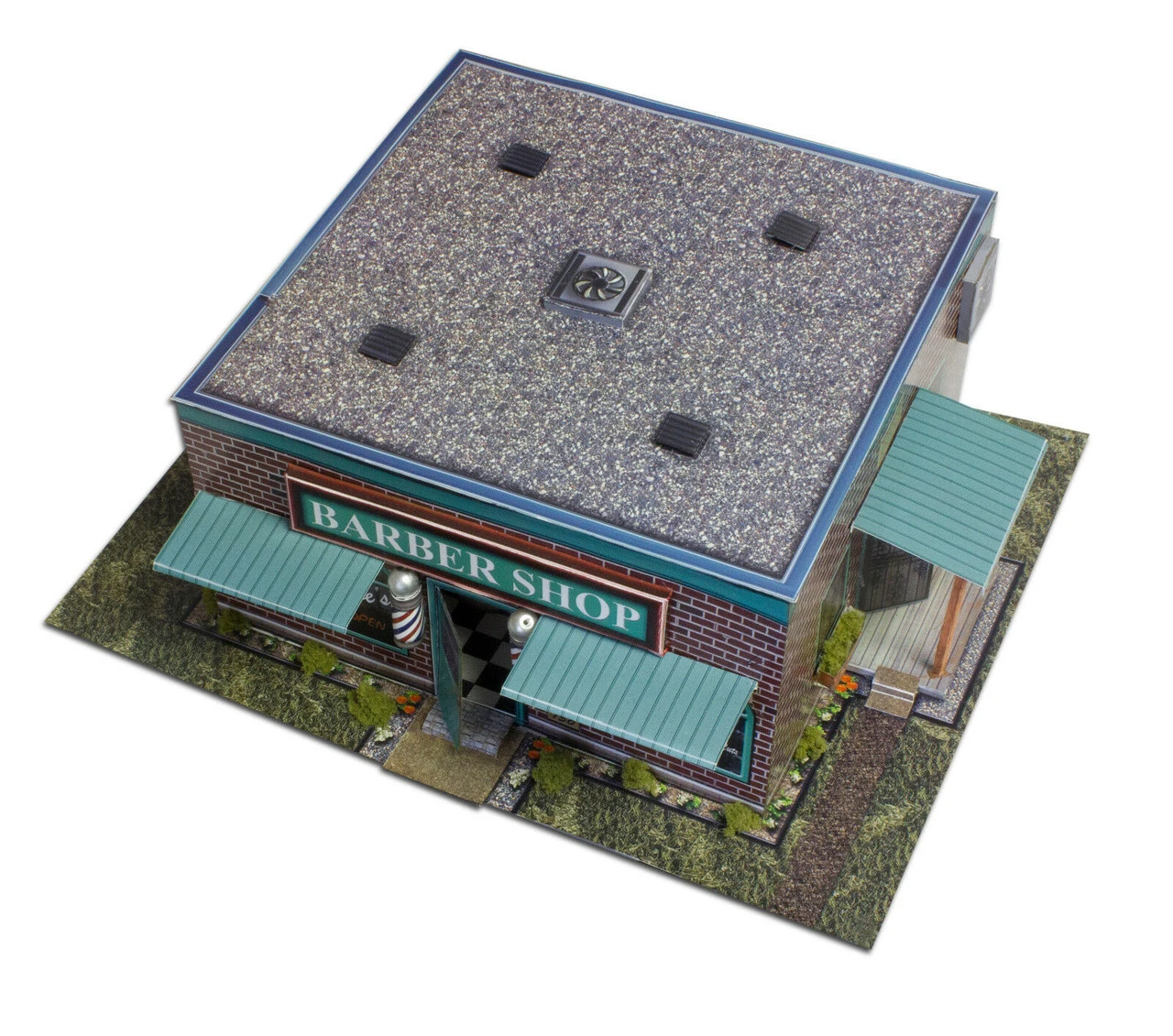 Barbershop Photo Real Scale Building Kit is a complete scale model set that comes ready to trim and assemble.