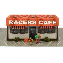 This Raceway Cafe kit features: opening doors, photo real cafe interior illusion rooms, roadside cafe sign, awnings, model people, burnt grass, roof vents, and model base with interior flooring.