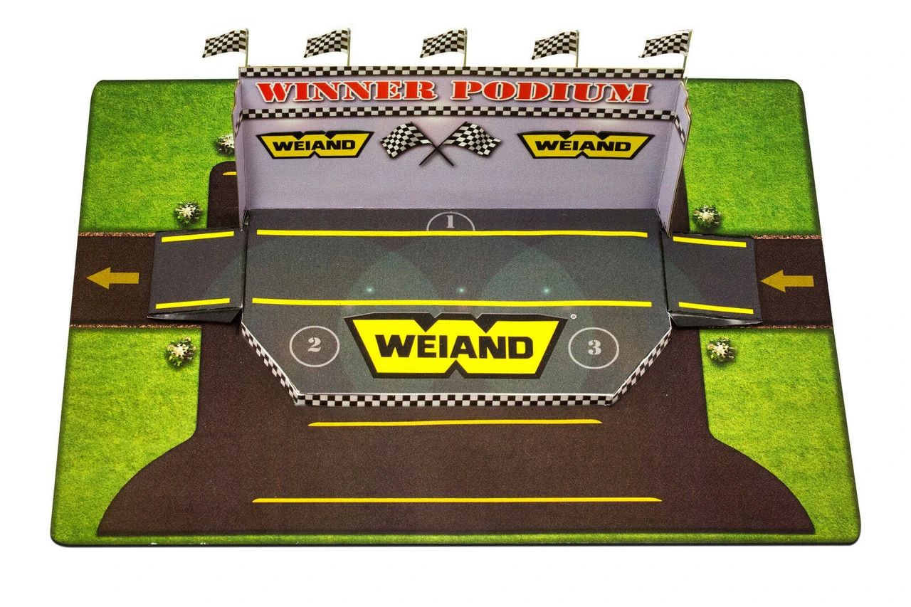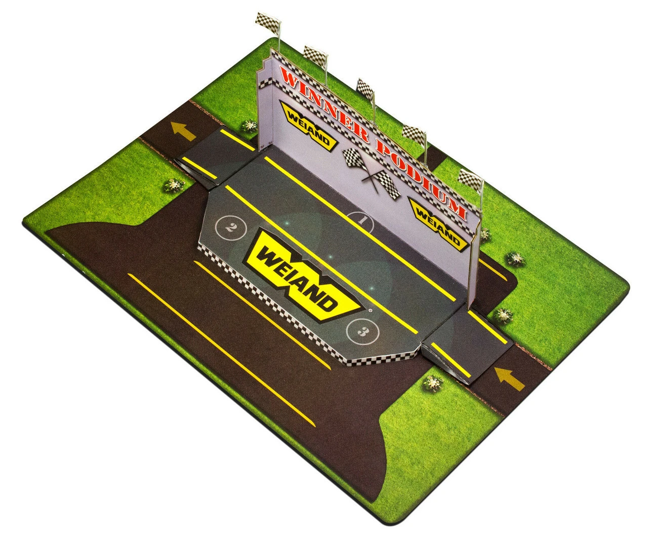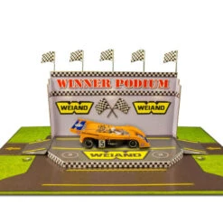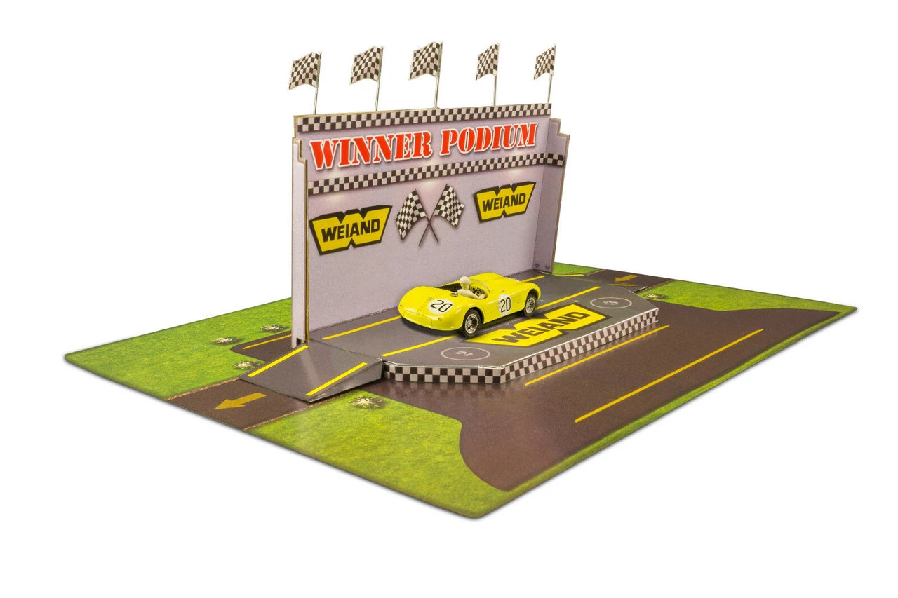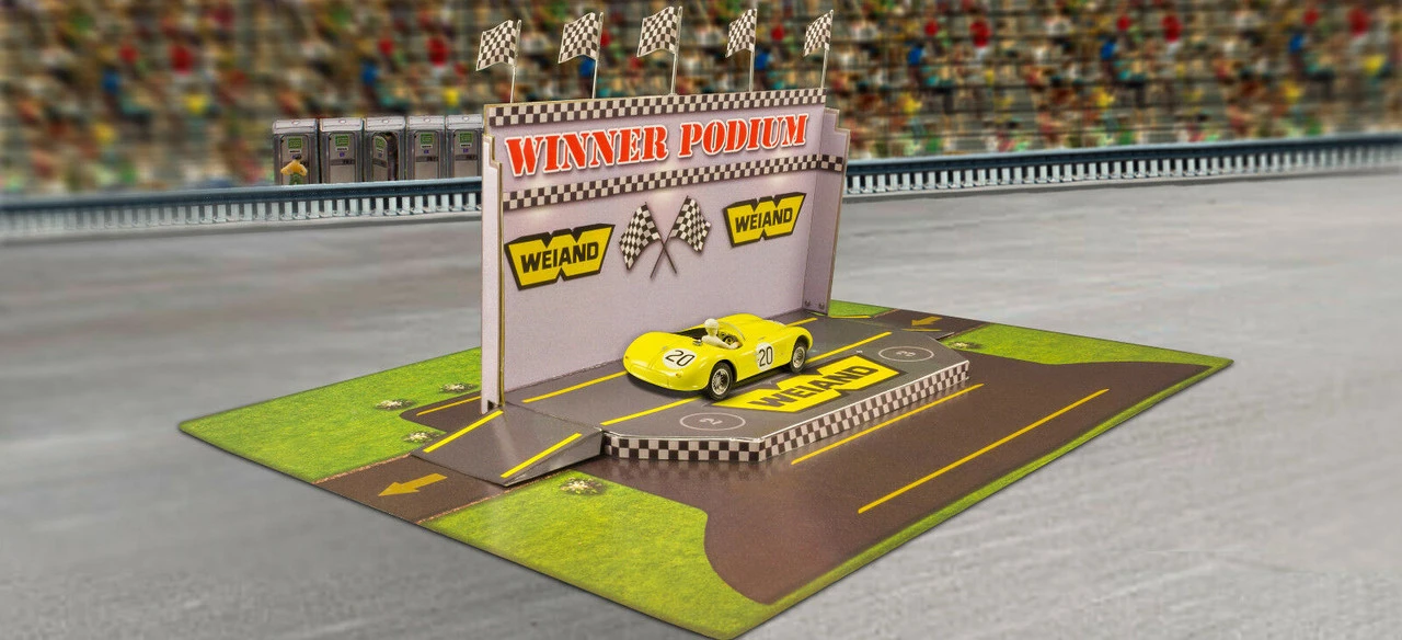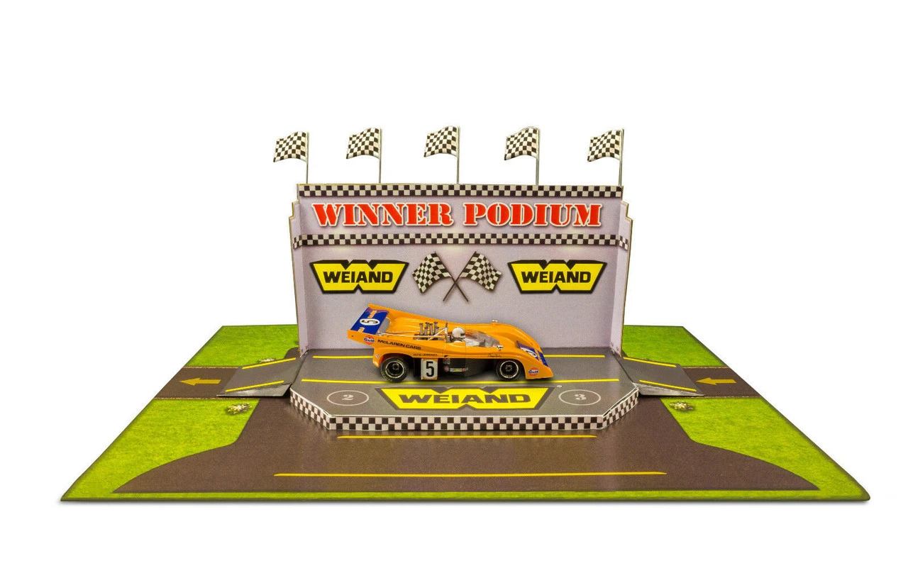 This Winners Podium features: Raised platform puts the focus on your collection car, several flags and photo real signs, finished detail from front to back, and detailed base with authentic Photo Real grass.