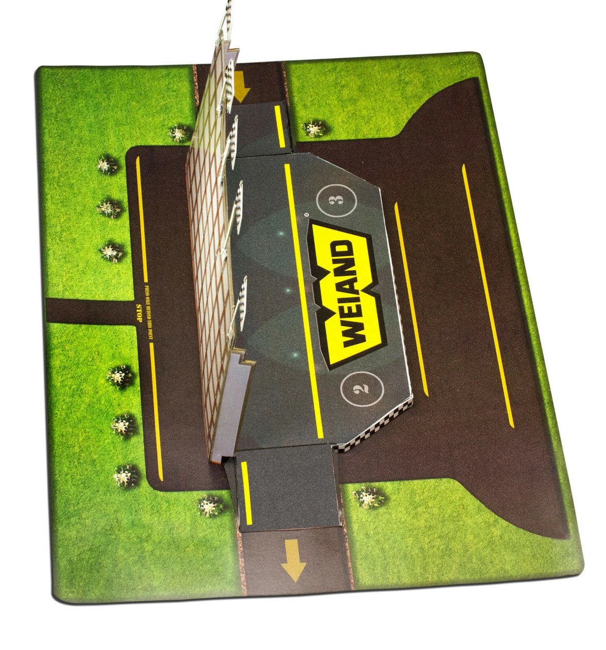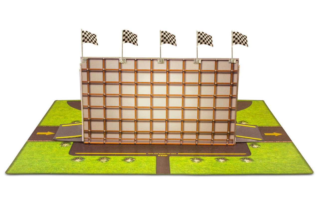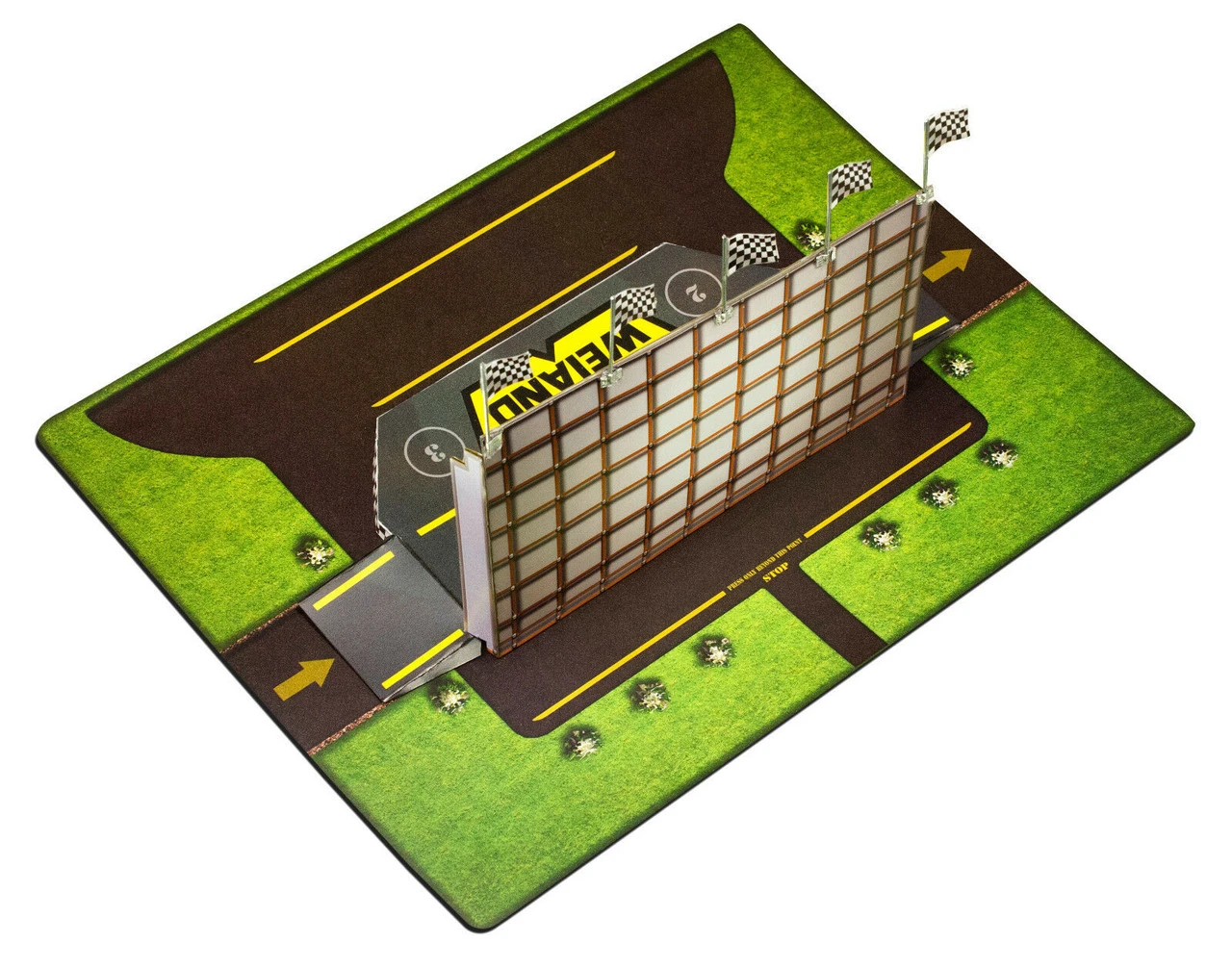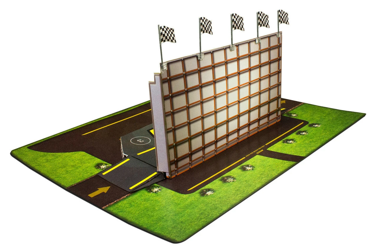 A 1/64 scale race-themed HO build kit. This kit is made specifically for HO scale slot car racing tracks and layouts. It will work great with both permanent and temporary set-ups. But is compatible with any Hot Wheels or Match Box dioramas or train layouts of this scale.