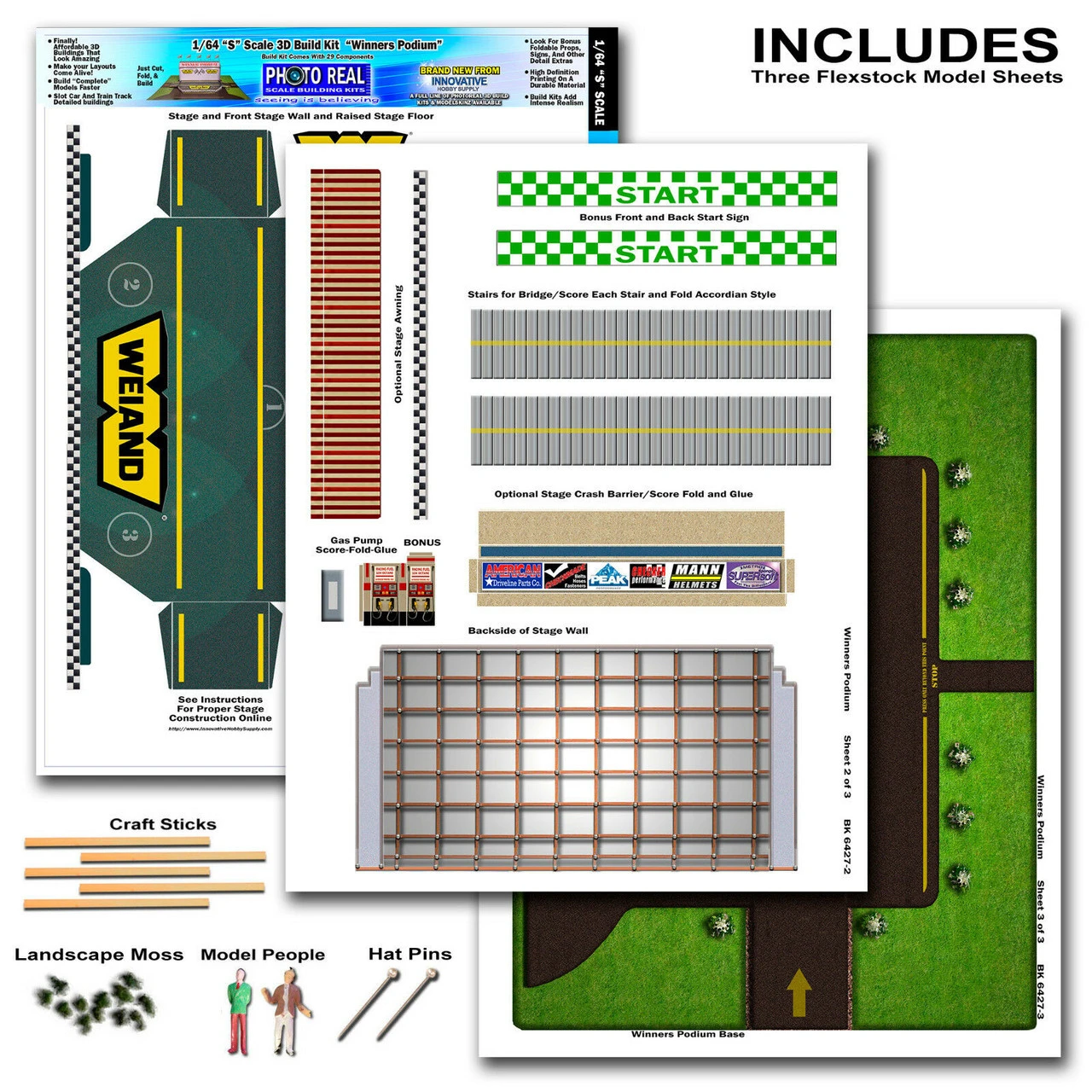 3 ea. Flexstock Model Sheets, small package of Landscape Clump Moss that is enough to landscape this kit and even includes 2 ea. HO scale People plus 4 ea. Craft Sticks that are needed for aid in assembly, but are totally hidden on the final build. 2 ea. flag holders for easy hanging. Each Winners Podium also comes with bonus Porta Potty’s. Unfortunately cars and track shown in photos are not included in this kit, sorry.