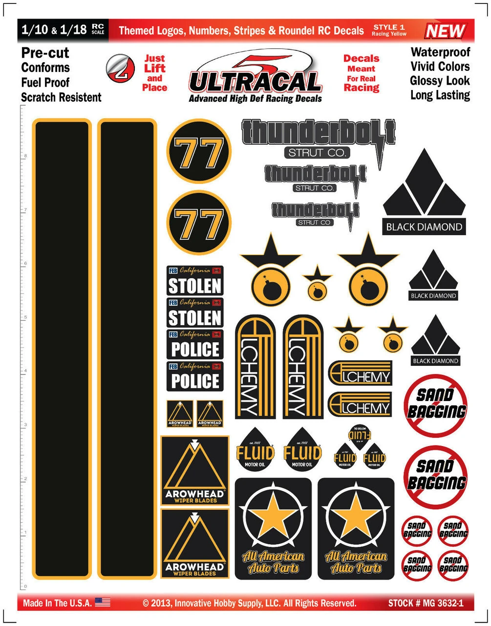 MG 3632-1 Ultracal Racing Yellow Themed Logos, Numbers, Stripes & Roundel RC Decals For 1:10 And 1:18 Scale