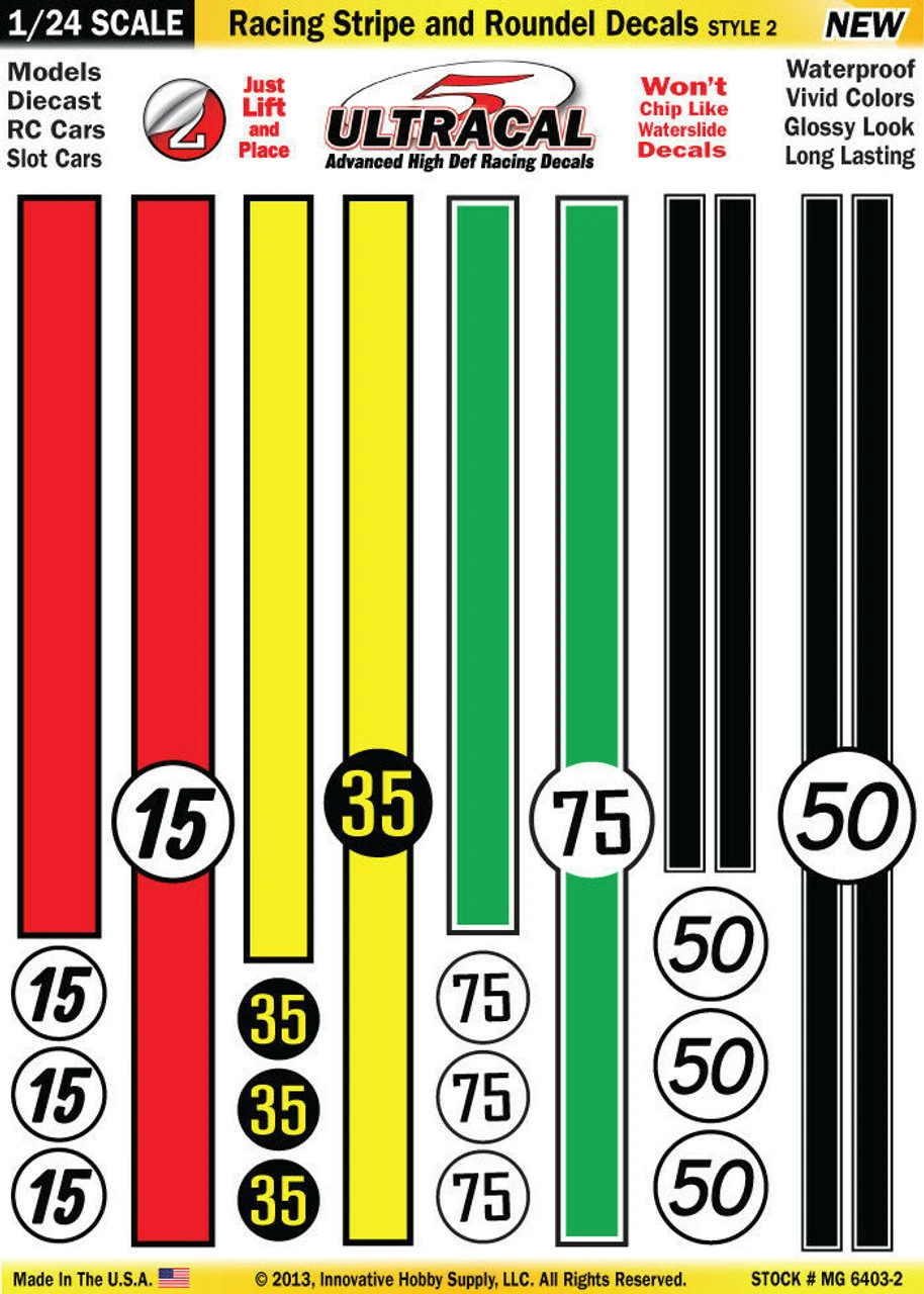 Made from highly precise equipment to achieve maximum detail and produced with a new micro-thin, space-age poly material using high-definition graphics. All of our Ultracal decals are bright, glossy, precision pre-cut, and fully opaque to achieve that high definition finish.