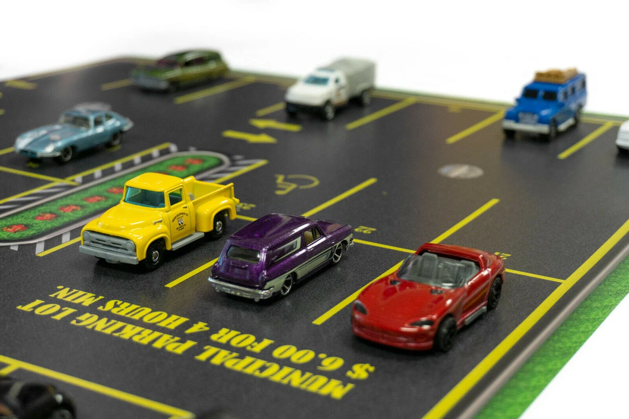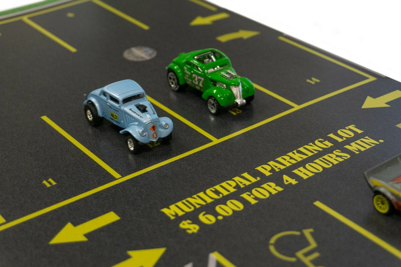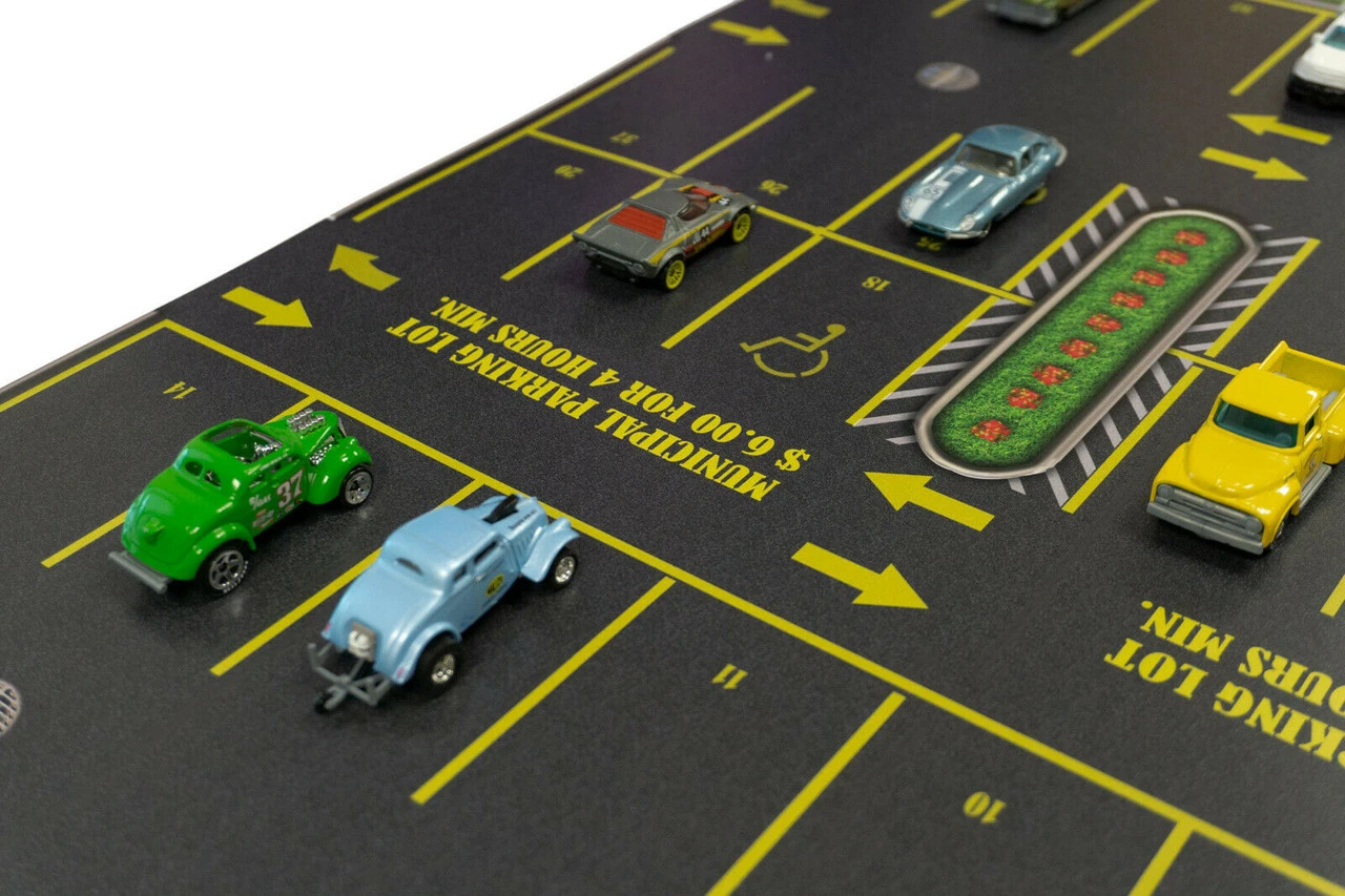 Each parking lot is waterproof, oil resistant, and made with a durable PVC material that is flexible which allows for easy storage.