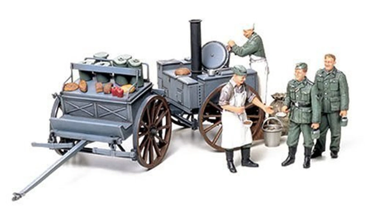 1/35 Scale. This kit by Tamiya comes with everything you see in the photo. The Wehrmacht was famous for the fact that on the battlefield, everyone, regardless of class ate the same food. Those rations consisted of basically the same elements that were eaten back in the homeland: bread made of wheat and rye, pork (mainly sausages), and potatoes. In fact, the staple diet of the Wehrmacht was a nutrient rich stew made by mixing all of those ingredients together. Piping hot coffee was also available, making even the most frightening battlefield feel a little more like the home. Distribution of these rations required the “Grobe Feldkuche Hf.13′, a two-wheeled field kitchen, the center of which housed a 200 liter pot. That stew-cooking vessel was double-bottomed, with a layer of glycerin between the inner and outer pot to prevent scorching and to aid in heat preservation. To the left of the pot was a 90 liter coffee maker, which dispensed from a tap. On the right was a range used to cook potatoes and sausages. Fire doors for each of these appliances were on the rear for the stoking of coal and firewood. The front of the field kitchen was the “Vorderwagen Hf.11”, a two-wheeled limber, which in addition to seating members of the cooking crew, had a food storage space below the seats and carried the “Speisentragen” food containers. Each Wehrmacht division consisted of baking companies (for bread) and butcher companies (for pork). There, bread was baked in oven trailers and pigs were made into sausage before being supplied to the various units. A single “Grobe Feldkuche Hf. 13” could feed 125 to 225 men. Skill level 2